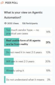 When asked about Agentic Automation, a recent Gartner Peer Poll showed that of the 158 participants 14% believe that Agentic AI is simply overhyped by vendors. Another 31% felt the ‘real usability’ of AI Agents is currently far from reality. A total of 58% of those surveyed simply do not have confidence in Agentic AI or in AI Agents of today. Shown here in the Gartner Peer Poll image.
