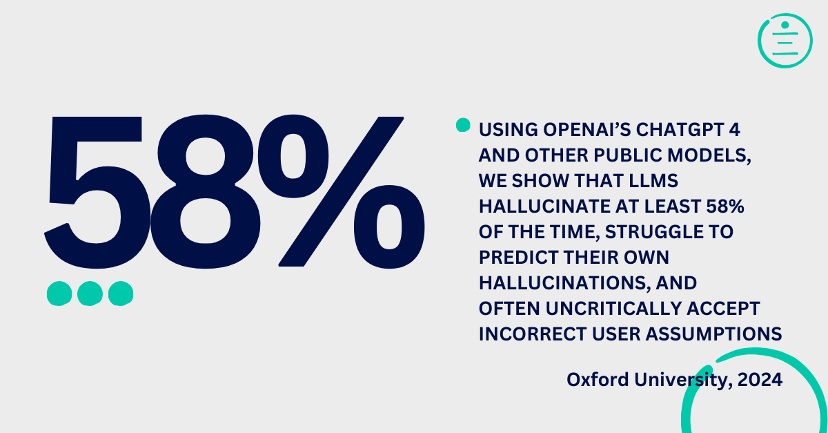 Artificial intelligence is transforming businesses around the world. From customer service to healthcare, AI is making processes more efficient, insightful, and scalable. But with this power comes risk. While Large Language Models (LLMs) can produce amazing results, they can also hallucinate, provide biased responses, and introduce data security risks. A study by SiliconAngle.com shows that generative AI models exhibit hallucinations in approximately 3% to 10% of their responses, leading to false or misleading information. While two other studies by Oxford University, and OpenAI point to the systems hallucinating in as many as 58% of the responses.