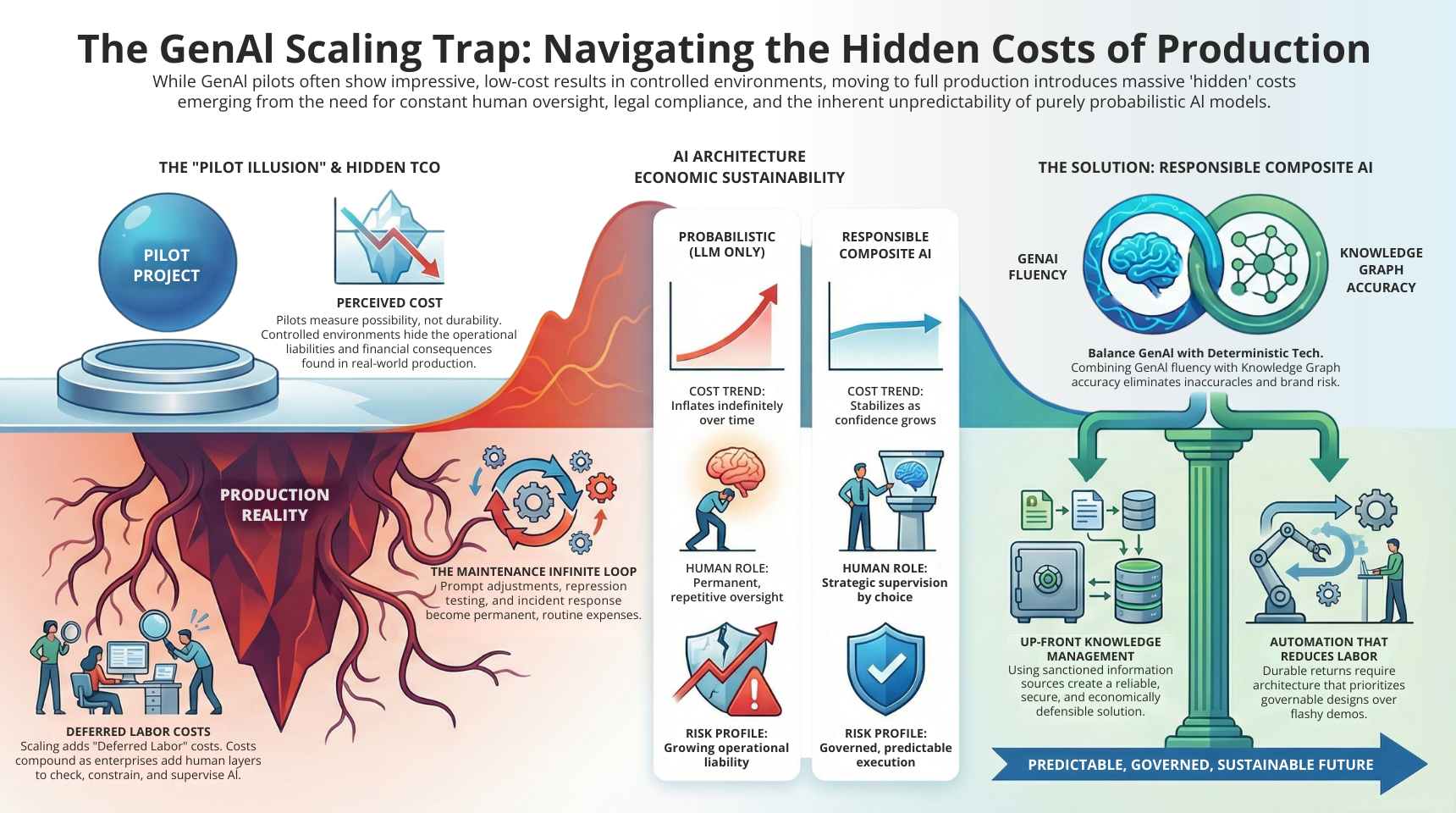 Most GenAI costs do not appear on pricing sheets. They emerge inside operations and governance layers. Probabilistic systems become troublesome because they need constant human oversight and supervision. Human validation becomes permanent, and inadvertently repetitive rather than transitional.